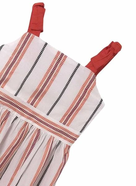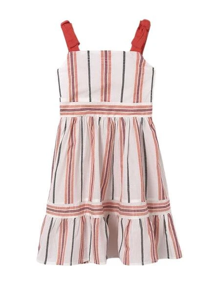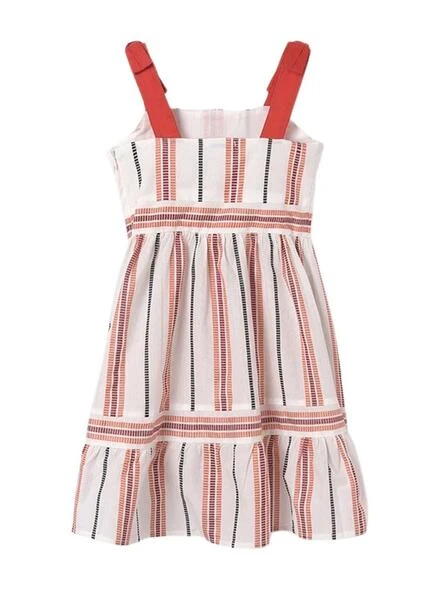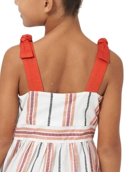 Robe Mayoral. Rayures imprimées. Bretelles avec nœud orange. Ourlet évasé. Coupe à la taille.