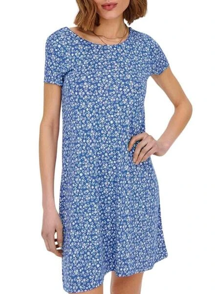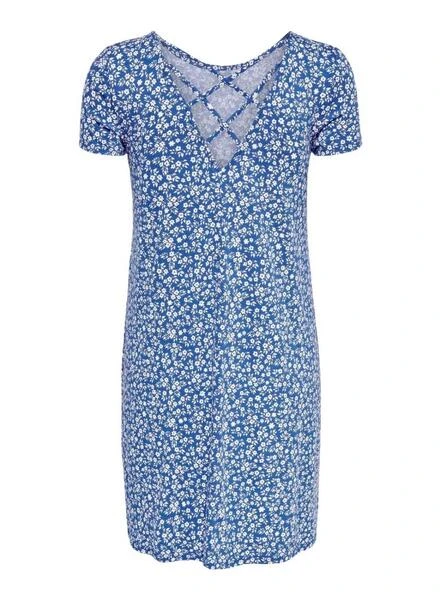 Robe Only. Modèle Bera. Couleur bleue. Manches courtes. Col rond. Ouverture dans le dos avec des lacets. Imprimé floral.