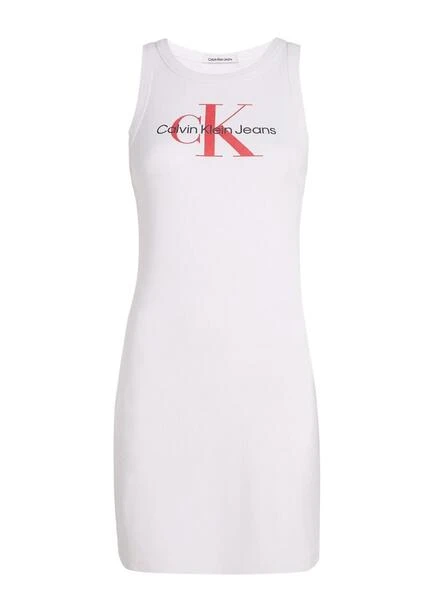 Robe Calvin Klein. Modèle Archival Monologue. Couleur blanche. Impression en rouge. Col rond élastique. Tissu côtelé extensible. Tricot en coton. Fabriqué avec des fibres recyclées. Coupe ajustée. Monogramme de Calvin Klein. Le modèle porte la taille S.
