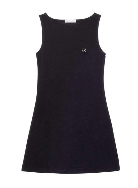 Robe Calvin Klein. Modèle Badge tank. Couleur noire. Tissu maille milano. Coupe évasée. Col bateau. Sans manches. Patch sur la poitrine.