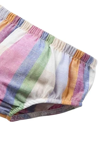 Robe Mayoral. Imprimé rayé multicolore. Sans manches. Poches latérales. Avec couvre-couche. Boutons pour le couvre-couche. Tissu en lin léger. Fermeture avec des boutons. Pour nouveau-né.