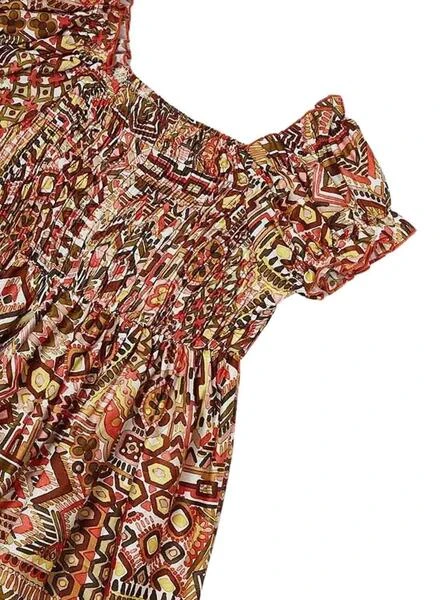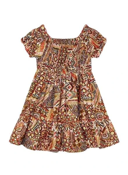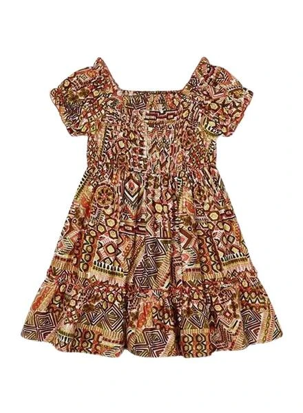 Robe Mayoral. Tissu nid d’abeille sur le haut. Manches courtes. Imprimé original. Détail de volants au col et aux manches.