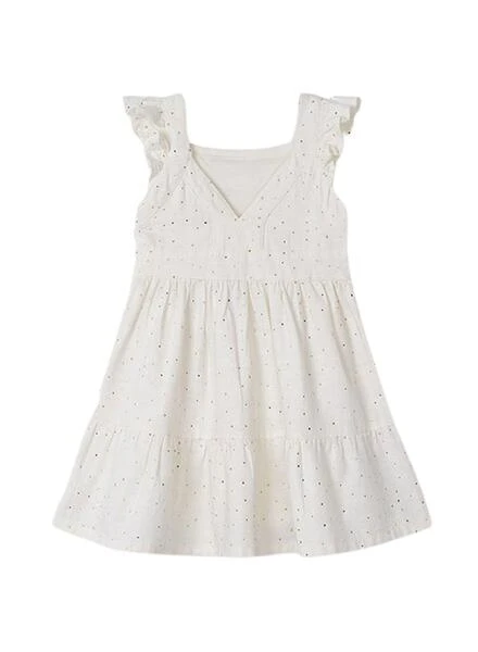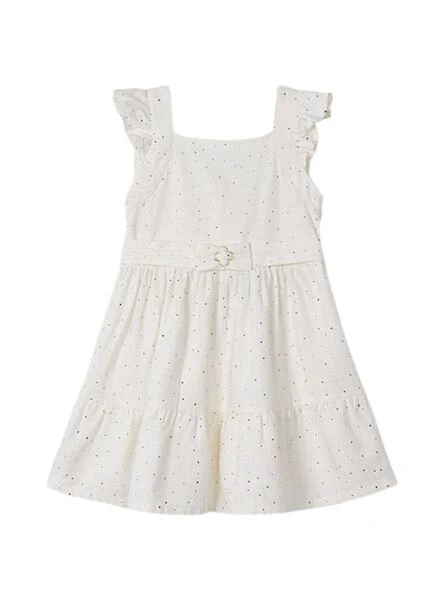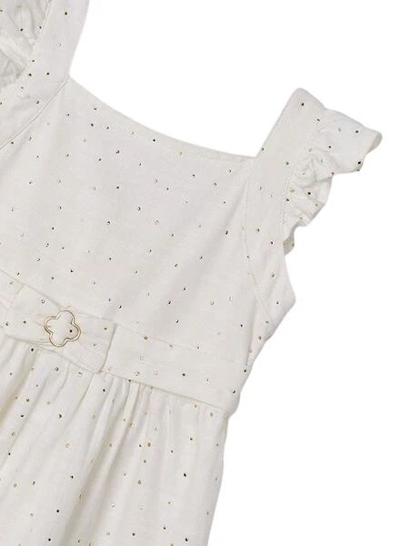 Robe Mayoral. Sans manches. Détail de volants sur les épaules. Coupe à la taille. Imprimé à pois métalliques. Nœud à la taille. Dos en V.