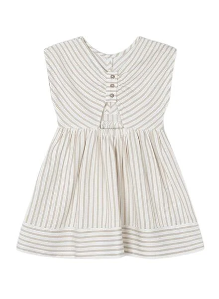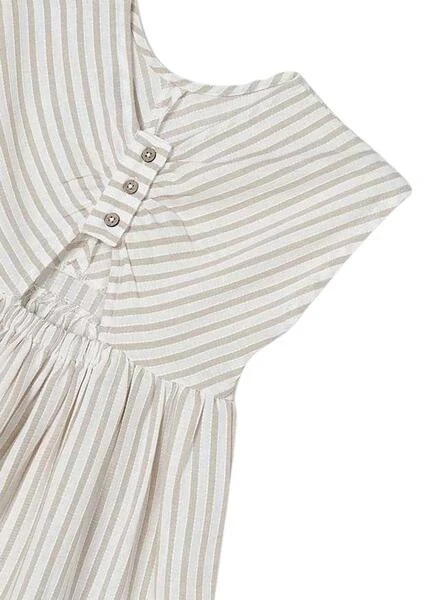 Robe Mayoral. Couleur beige. Col rond. Sans manches. Coupe à la taille. Rayures imprimées. Ouverture arrière. Fermeture avec trois boutons dans le dos.