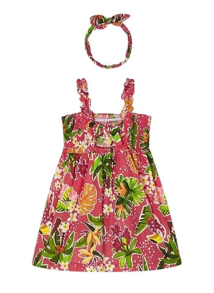 Robe Mayoral. Avec serre-tête. Imprimé tropical. Avec bretelles. Partie supérieure froncée. Avec volants. Ouverture dans le dos. Détail de nœud dans le dos.