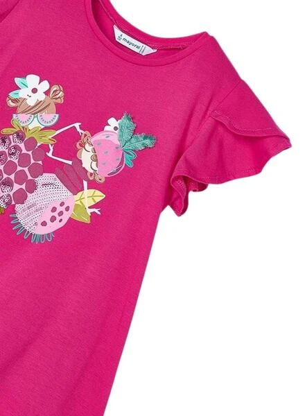 Robe Mayoral. Encolure ronde. Manches courtes à volants. Avec sac. Imprimé sur le devant. Coupe ample.