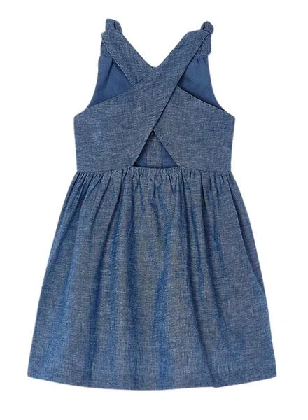 Robe Mayoral. Couleur bleue. Tissu en lin. Fermeture avant avec des boutons. Poches à la hanche avec des nœuds. Dos croisé avec une petite ouverture. Détail de nœuds sur les épaules.