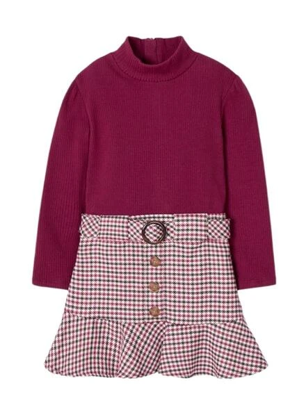 Robe Mayoral pour fille. Imprimer de cadres. Imitant le design de la jupe et du t-shirt. Plaid Jupe avec ceinture et boutons décoratifs. Cou de kyste. Extrémités côtelées. Jupe avec vol dans le grave. Manche longue.