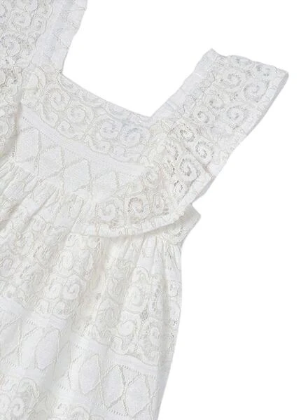 Robe Mayoral. Crochet tissé. Couleur beige. Sans manches. Aisselles avec des volants. Col carré. Format court.