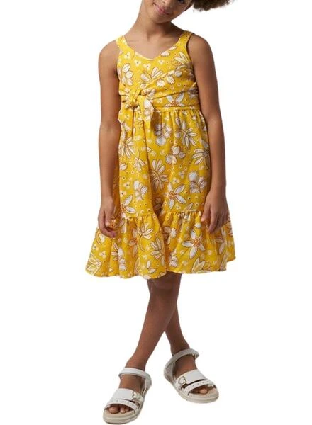 Robe Mayoral. Couleur jaune. Imprimé de fleurs. Avec bretelles. Détail de nœud sur la poitrine. Dos élastique. Ourlet évasé. Volant sur le bas.