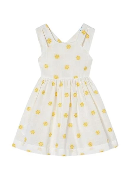 Robe Mayoral. Imprimé de fleurs brodées jaunes. Sans manches. Dos avec bretelles croisées. Coupe à la taille. Tissu jacquard.