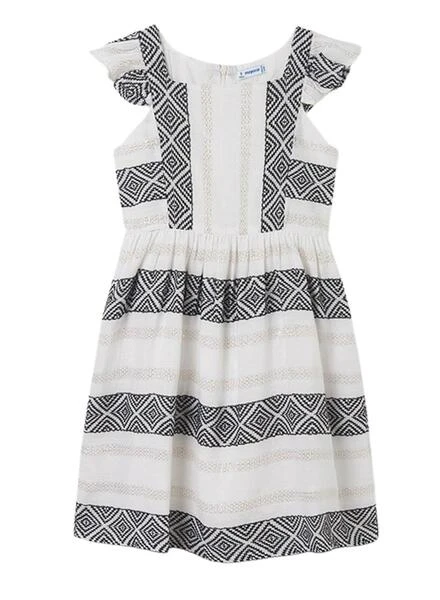 Robe Mayoral. Printed combiné. Encolure carrée. Volantss sur les manches. Fermeture éclair invisible au dos.