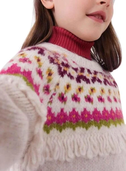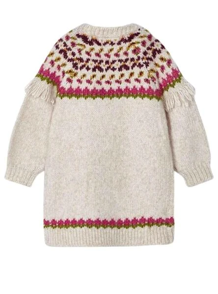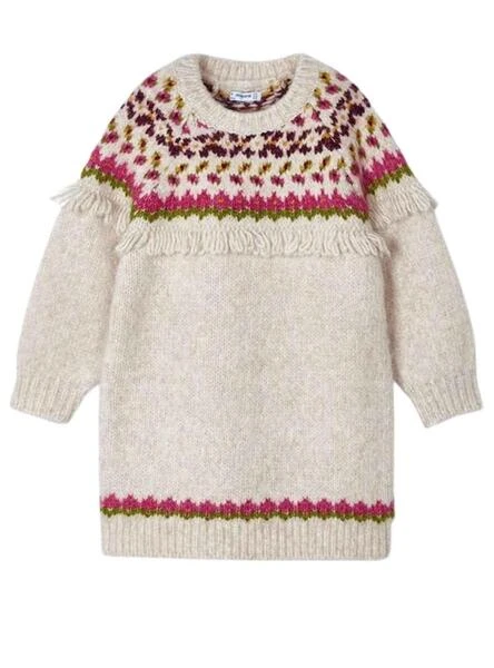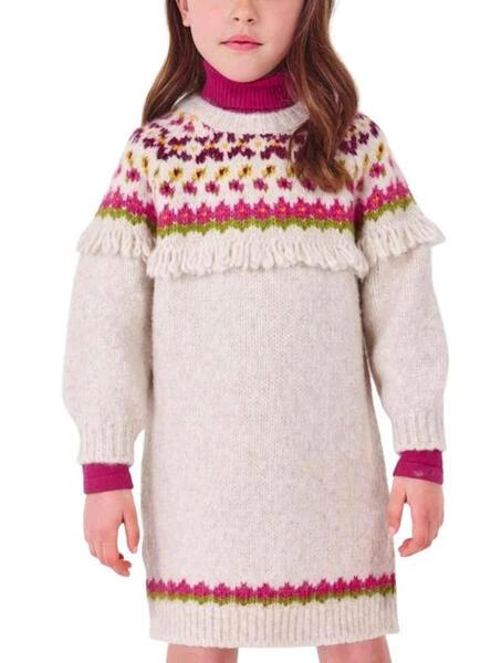 Robe Mayoral. Tricot. Col rond. Poignets et ourlet élastiques. Règle Manches. Détails frangés. Détails en rose, vert et jaune.