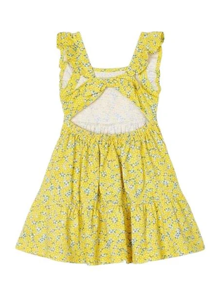 Robe Mayoral. Printed de fleurs. Dos ouvert avec nœud. Manches avec volantss. Taille elastique. Encolure carrée. Jupe avec volantss. Tissu 100% coton.