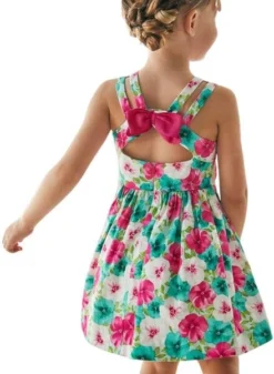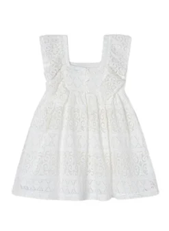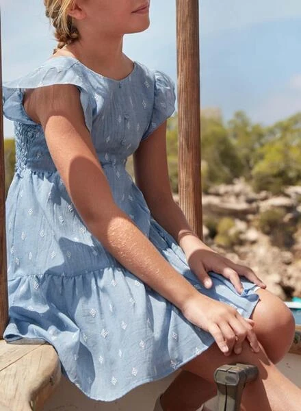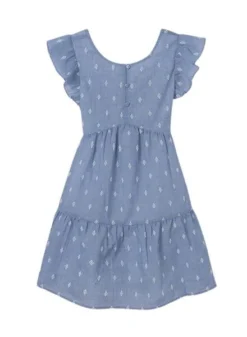 Robe Mayoral. Modèle Mini Print. Couleur bleue. Manches à volants. Col rond. Fermeture avec des boutons. Ouverture dans le dos. Imprimé sur l’ensemble de la tenue.