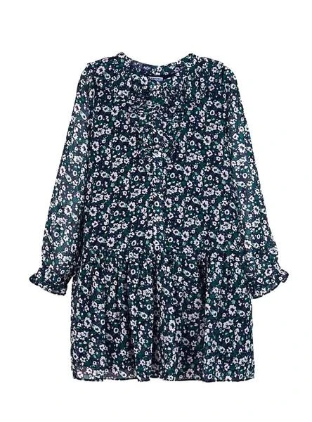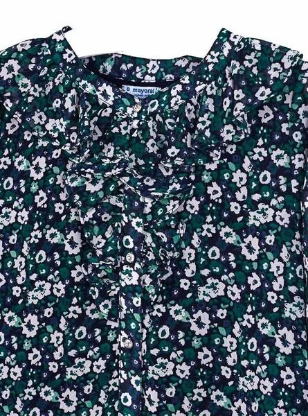 Robe Mayoral. Modèle en mousseline à motifs. Couleur marine. Motif floral. Manche longue. Poignets élastiques. Col rond Fermeture à boutons sur le devant. Tissu fluide en mousseline. Doublure intérieure Cou à volants.