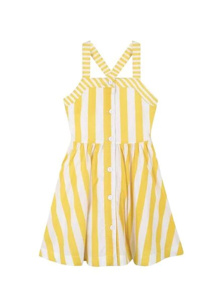 Robe Mayoral. Modèle Summer. Couleur jaune. Imprimé rayé blanc. Fermeture boutonnée sur le devant. Jupe avec volume. Bretelles croisées. Encolure au dos.