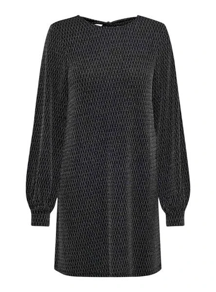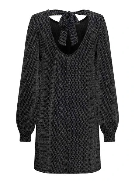 Robe Only. Modèle Carol. Tissé avec du fil lurex. Effet pailleté argenté. Décolleté dos avec noeud. Coupe mini. Manche longue. Élastique.
