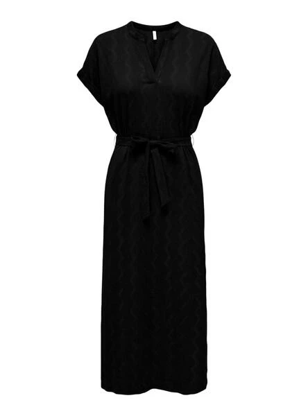 Robe Only. Modèle Day. Couleur noire. Manches courtes. Col en V. Détail de ceinture. Longueur 7/8.