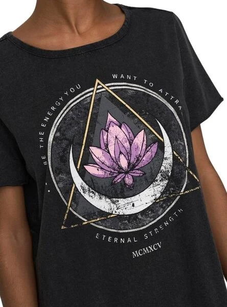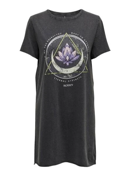 Robe Only. ModÚle Lucy. Couleur noire. Effet usé. Col rond. Style t-shirt. Manches courtes non finies. Illustration imprimée sur la poitrine.
