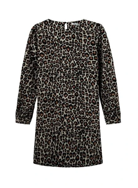Robe Pepe Jeans. Modèle Bego. Multicolore. Imprimé léopard. Col rond. Manche longue. Court. Etrier arrière. Fermeture au dos avec bouton.