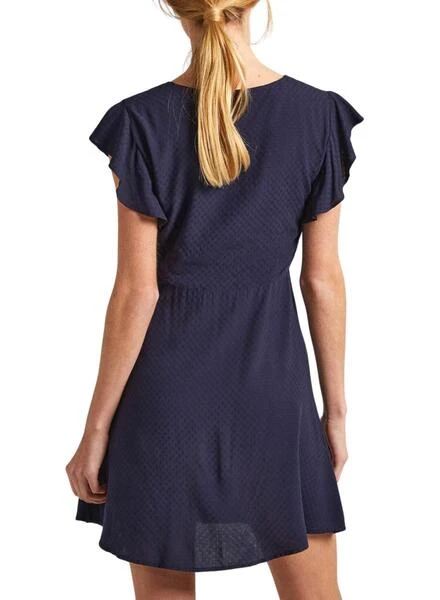 Robe Pepe Jeans. Modèle Camila. Couleur bleu marine. Col en V prononcé. Manches papillon avec volants. Plaque métallique avec logo de la marque. Fermeture éclair invisible sur le côté. Coupe mini.