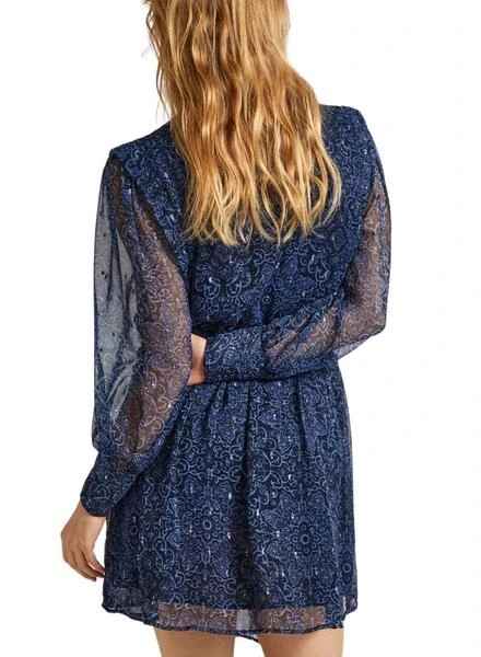 Robe Pepe Jeans. Modèle Camille. Couleur bleu marine. Encolure en v. Style croisé. Taille élastique. Imprimé ethnique. Manches transparentes.