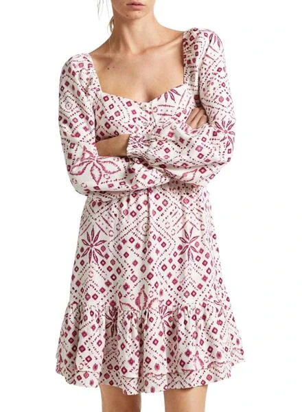 Robe Pepe Jeans. Format court. Motif géométrique. Style skater. Encolure carrée. Manches longues bouffantes. Fermeture boutonnée sur le devant. Taille cintrée. Poches latérales. Motif géométrique. Panneau froncé dans le dos. Le modèle porte la taille S.