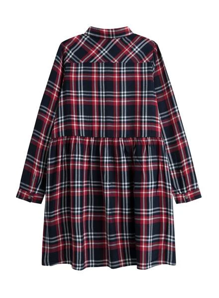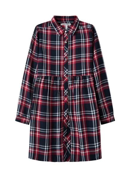 Robe Pepe Jeans. Modèle Luli. Coloris bleu marine, rouge et blanc. Imprimé tartan. Fermeture automatique par bouton. Manche longue. Manquant avec vol. Style de robe.