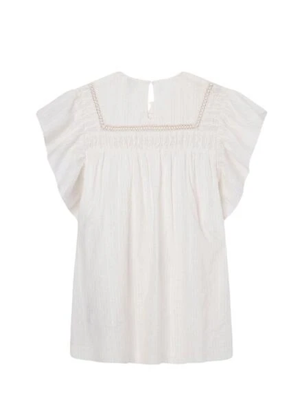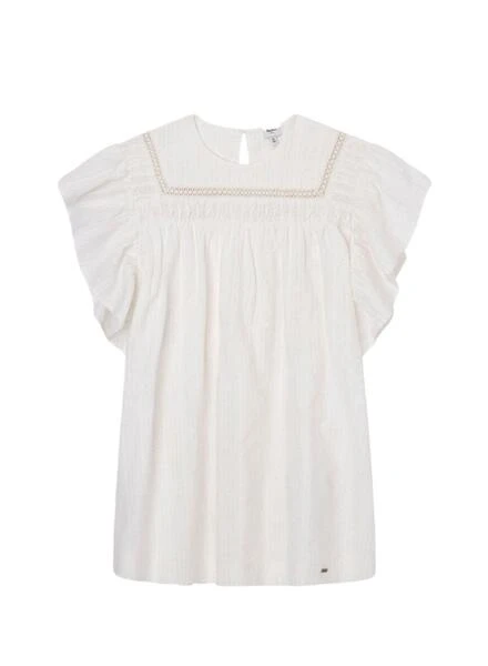 Robe Pepe Jeans. Couleur blanche. Détails brodés et plissés. Col rond. Manches papillon. Fermeture boutonnée à l’arrière du col. Rayures métallisées imprimées.