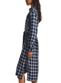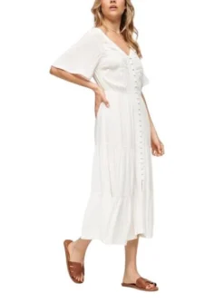 Robe Superdry. Modèle brodé. Couleur blanche. Encolure en V. Boutons avant. Manches courtes. Logo métallique à la taille. Coupe midi. Tissu léger.