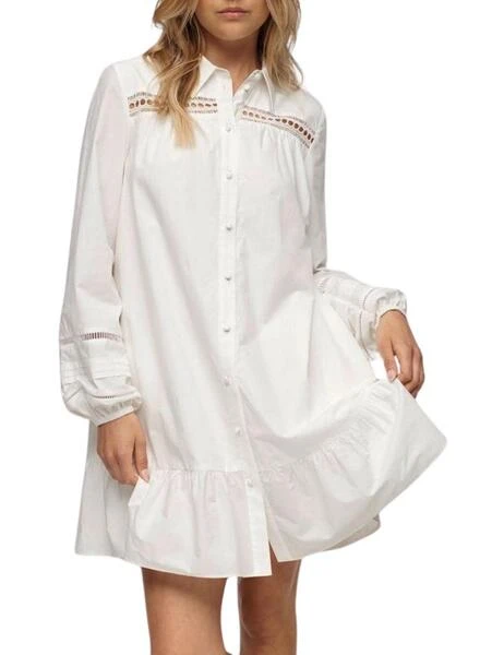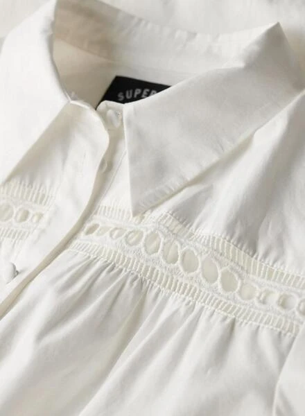 Robe Superdry. Modèle Lace Mix. Couleur blanche. Coupe décontractée (oversize). Manches longues. Col polo. Fermeture avec boutons sur le devant. Détails côtelés et à volants. Dentelle sur la poitrine et les manches. Manches larges. Le mannequin porte la taille S.