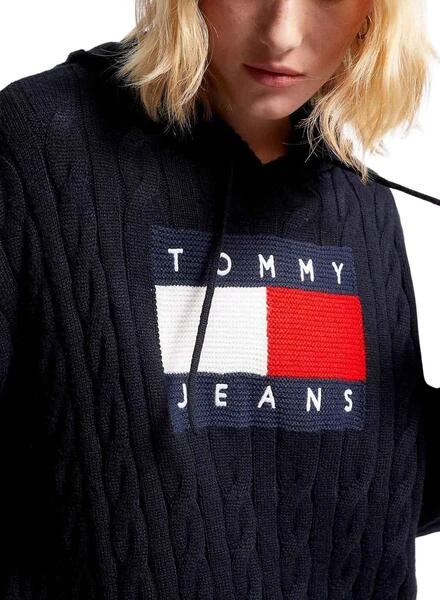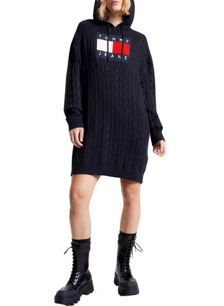 Robe Tommy Jeans. Modèle de câble Flag. Couleur noir. Maille tressée. Manche longue. Epaules légèrement tombantes. Le mannequin porte une taille S. Poignets et ourlet élastiqués. Détails distinctifs de la marque.
