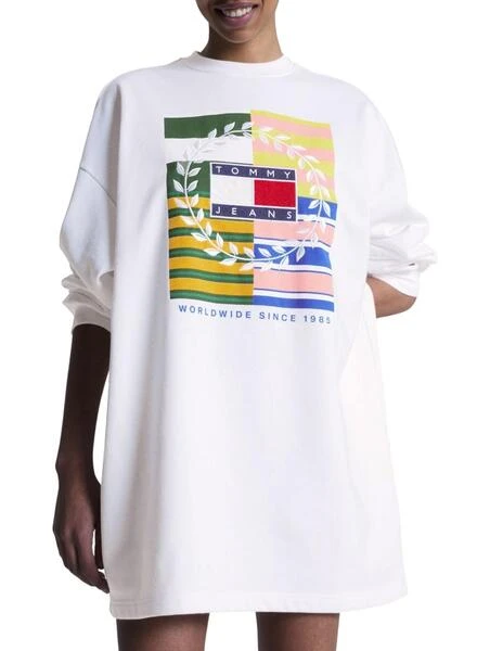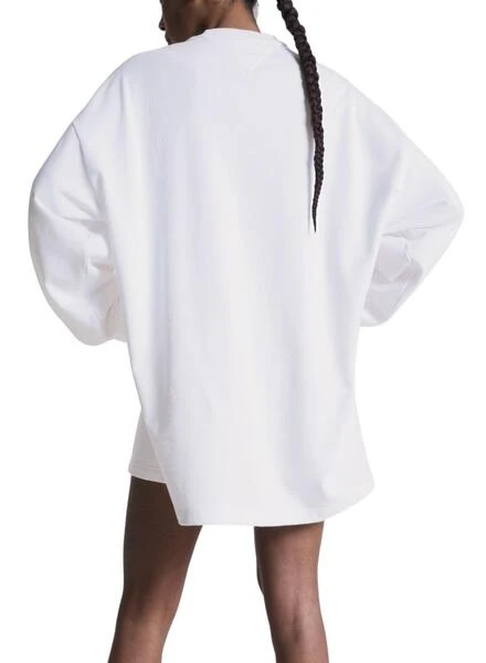 Robe Tommy Jeans. Modèle de luxe. Couleur blanc. Graphisme Printed sur la poitrine. Manche longue. Col rond.
