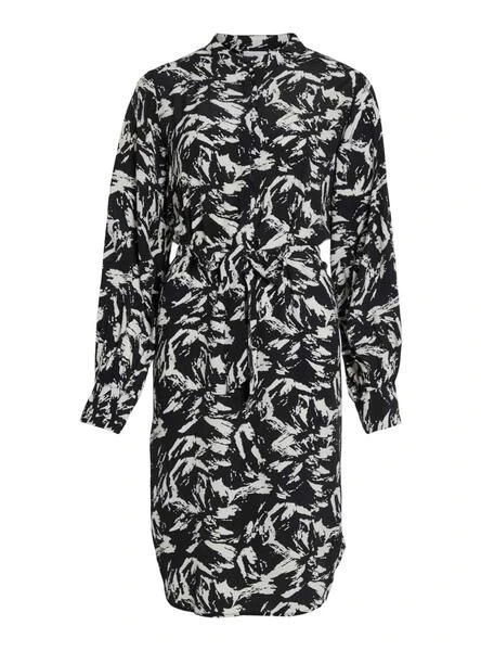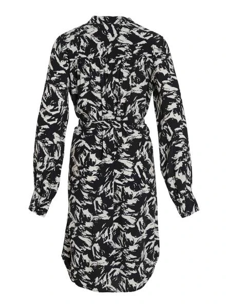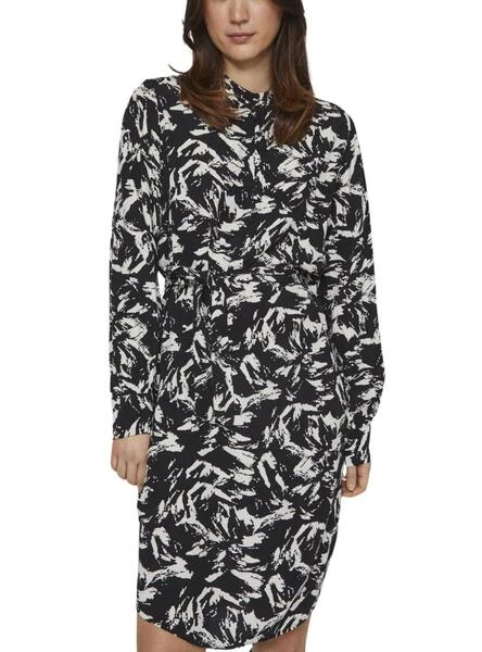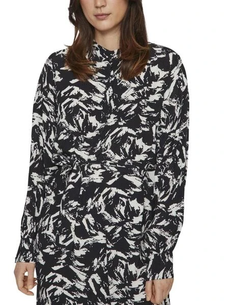 Robe Vila. Modèle Viboa. Printed en noir et blanc. Manche longue. Coupe au dessus du genou. Regular fit Ceinture auto-nouant. Boutons sur le devant. Cou Mao.