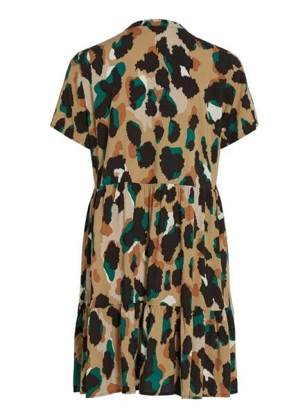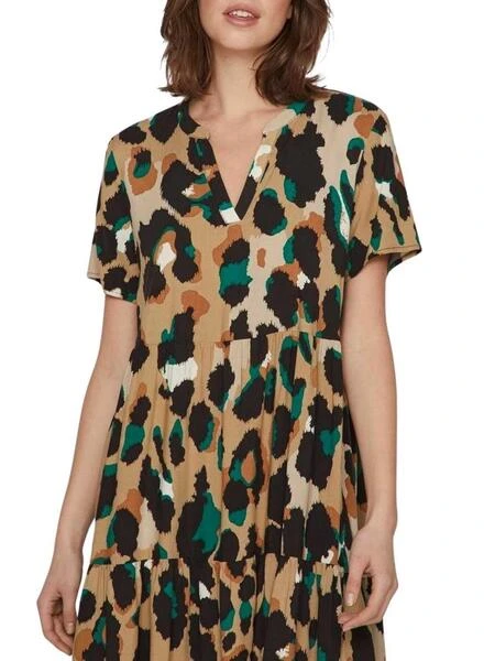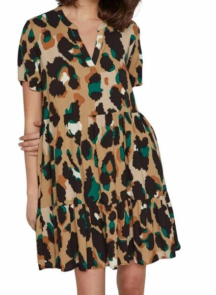 Robe courte Vila. Modèle Vipaya. Col en V. Imprimé léopard. Manches courtes. Volants en bas. Imprimé léopard. Longueur au-dessus du genou. Coupe régulière. Couleur beige, noir et vert.