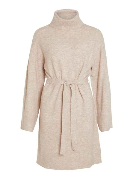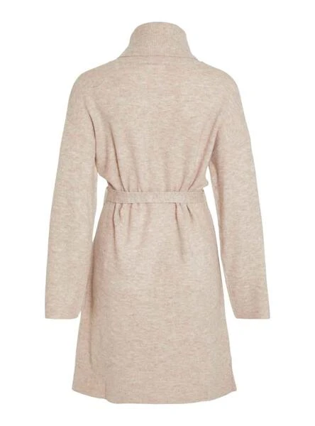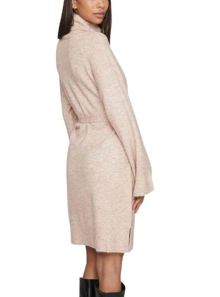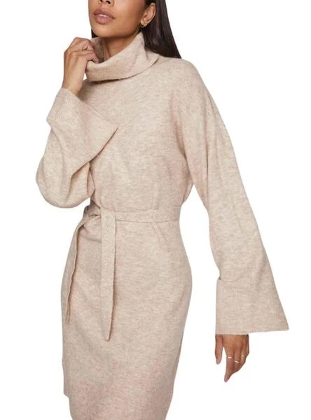 Robe Vila. Modèle Vivimalina Long. Couleur beige « Natural Mela ». Long cou. Jusqu’au genou. Taille nouée. Tissu doux et élastique. Détail de fente latérale. Épaules tombées. Regular fit. Le mannequin porte la taille M.